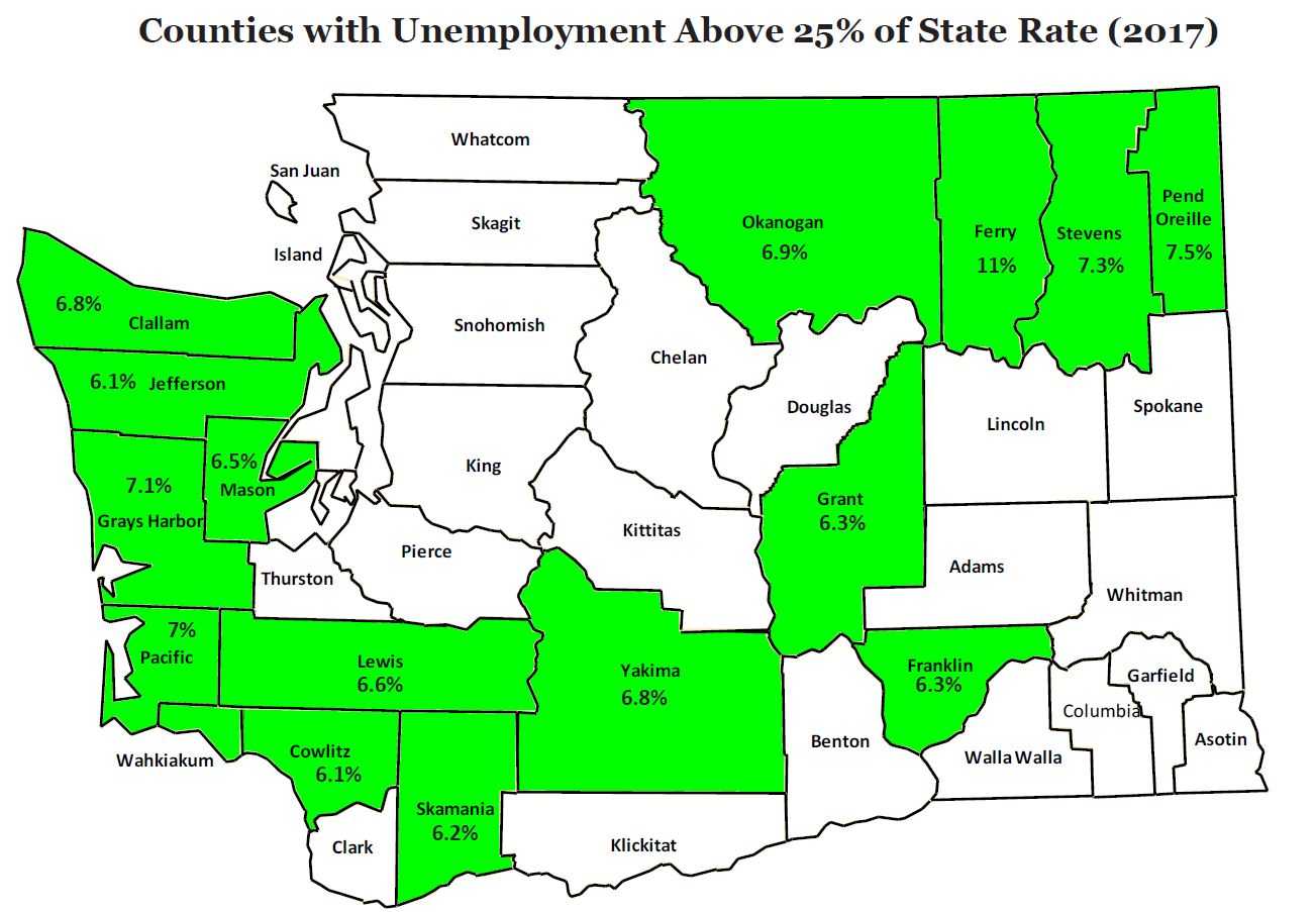 Jefferson County also suffers from low wages. According to the Washington Employment Security Division, the average annual wage in Jefferson County was $36,381, far below the state average of $59,073.