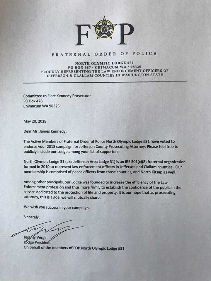 1) I am being endorsed by the LOCAL North Olympic Lodge, which only represents members of our LOCAL law enforcement community. This is NOT the national organization, I have nothing to do with them and I do not support the national organizations past endorsements. This is a LOCAL race, so let’s keep things local ok?