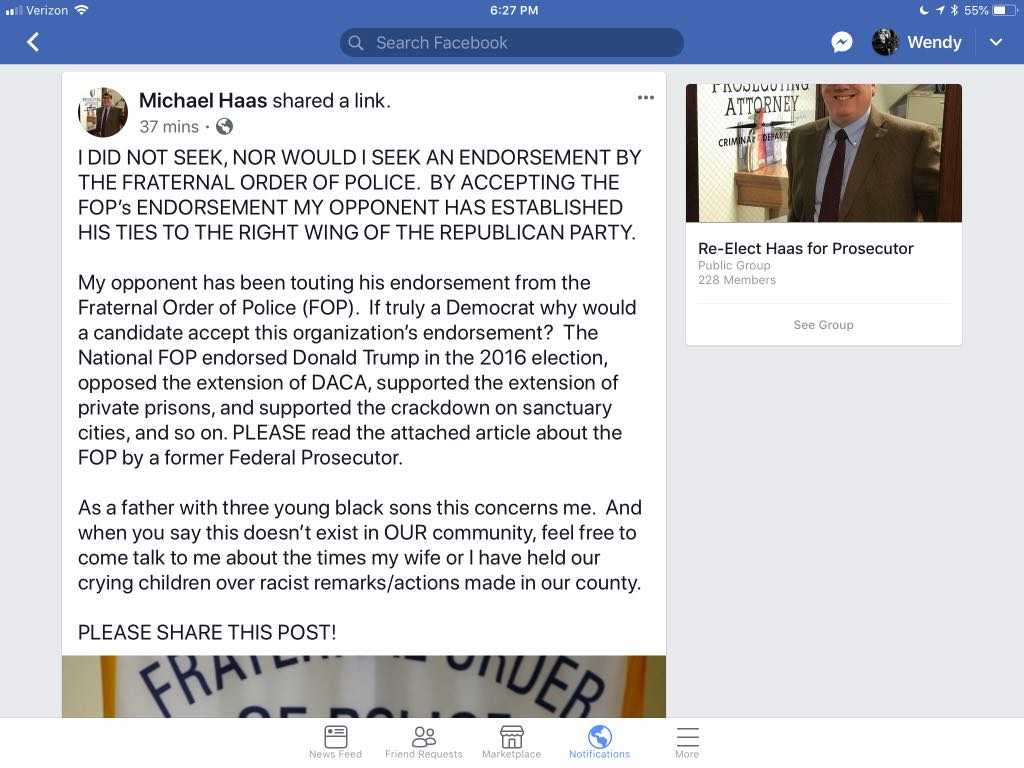 In response to the FOP endorsement, Haas attacked the organization representing local law enforcement in a post at the Re-elect Haas for Prosecutor Facebook page.