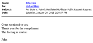 When Cain got what he wanted he flattered Haas. For instance, after Haas agreed to the order for disclosure of Dove House records—which put the onus on SL to bring her own motion if she objected—Cain told Haas, “The citizens of Jefferson County really do not know how luck[y] they are to have a prosecutor who cooperates with Defense on matters such as this.” “You’re too kind,” Haas responded.