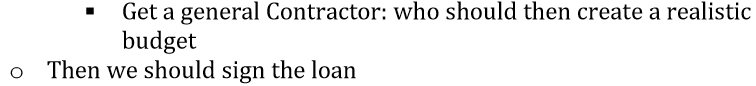 At the September 8, 2018, meeting, in discussion of whether the group should sign the loan documents, this entry was recorded in the group’s minutes: “Get a general Contractor: who should then create a realistic budget…then we would sign the loan.”