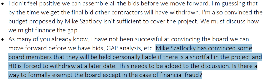 A November 13, 2018 email from Mark Cooper, Homeward Bound’s treasurer, to City Manager David Timmons and others states, “I’m also convinced the budget proposed by Mike Szatlocky [the former project manager] isn’t sufficient to cover the project. We must discuss how we might finance the gap.” Cooper further stated that Szatlocky “has convinced some board members that they will be held personally liable if there is a shortfall in the project and HB is forced to withdraw at a later date. This needs to be added to the discussion. Is there a way to formally exempt the board except in the case of financial fraud?”