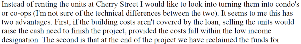 The Treasurer’s concern about a funding shortfall is serious enough that he has asked the city about the possibility of the apartments being sold as condos so that the sale proceeds from the first sales in the uncompleted building could finance construction of the rest of the project:
