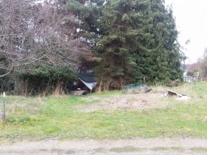 The photograph for this story was taken February 27, 2020. It shows a trashed out camp in the trees just below the empty building that was barged from Victoria, B.C. nearly three years ago. The grounds are