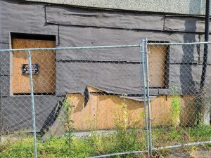 But they’ve known all along it was not going to happen. Nothing has been happening. They don’t even take care of the building or grounds. We’ve previously reported city inspectors found holes in floors large enough to swallow a person. Trash is scattered around the property, now hidden by waist high weeds. On our most recent visit we observed that the doors were wide open and the black material protecting the plywood was fraying and torn. Other signs of deterioration around the building are evident. The condition of the building reminds one of an expensive Christmas gift, broken and forgotten, after the child grew bored with it and moved on to new toys that are more interesting and less trouble.