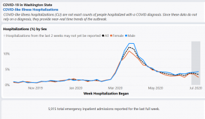 Many COVID patients require long periods of hospitalization, two weeks and maybe more. But some patients are turned around and released the next day (e.g., the 90-year old Jefferson County woman diagnosed with COVID in June). Those patients who sadly die no longer occupy a hospital bed. Those who recover–which is everyone else–return home and free up their bed. DOH, curiously, does not report COVID recoveries on any table or graph I could find. I have also never heard Jay Inslee celebrate recoveries in his unrelenting press conferences.