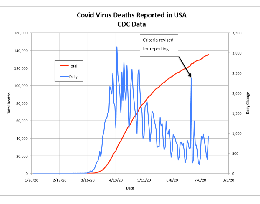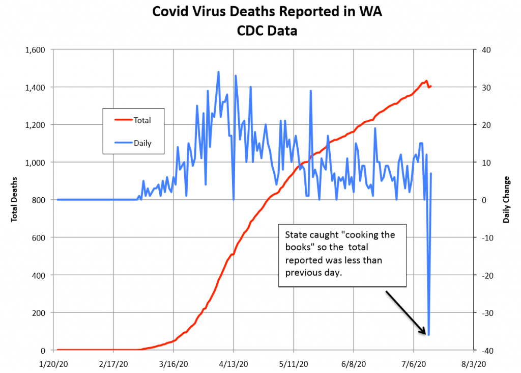 The number of Washington deaths reported daily peaked at 34 on April 6 and recently the total has increased daily by no more than 15 per day. On July 13 the Washington state data had a daily change of minus 36. That was a correction made after Washington State was caught “cooking the books”. https://www.freedomfoundation.com/washington/wa-dept-of-health-to-stop-counting-deaths-improperly-attributed-to-covid-19/