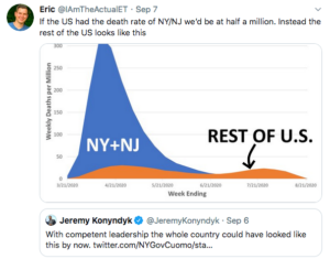 Add to this one consideration from beyond our state’s borders that shows COVID-19’s lethal impact is not “everywhere.” This image shows that COVID deaths, rather than being “everywhere,” were concentrated substantially in only two states, New York and New Jersey.