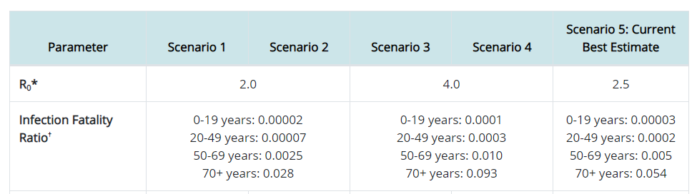 The CDC’s lead-up to its conclusions rolls out various scenarios, parameters and qualifications. Go ahead and take the time to read the full report for a deeper understanding. Thankfully, they reduce the verbiage to a “current best estimate.” Here’s their table. We’ll concentrate on the column entitled “Scenario 5: Current Best Estimate.”