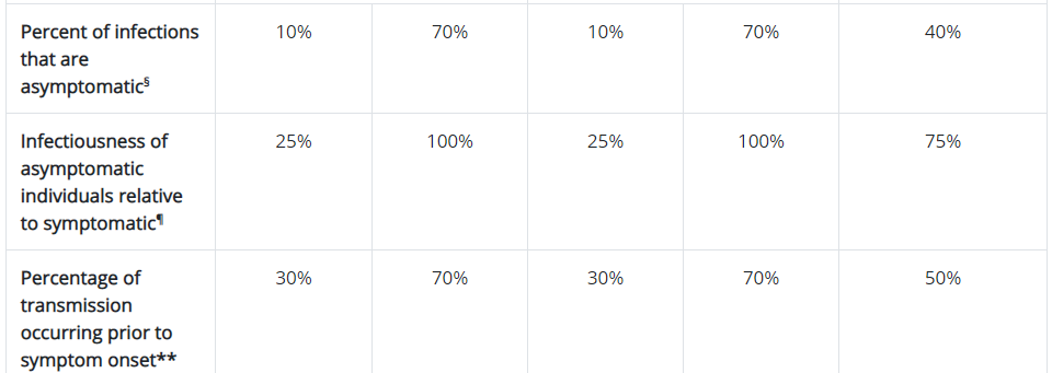 The “Current Best Estimate” column is again to the far right. Forty percent of people infected may suffer no symptoms, such as coughing, shortness of breath, blue lips, confusion and fever. But the infectiousness of asymptomatic people is very high and the percentage of transmissions occurring prior to the onset of those symptoms also can’t be ignored.