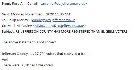 Jefferson County Auditor Rose Ann Carroll in an email to County Manager Phillip Morley says the Judicial Watch analysis is incorrect. I will pass this on to Judicial Watch and seek their explanation. I also sent an email to the Auditor to ask how she calculated precisely 30,107 eligible voters and what steps her office takes to prevent people in other states from getting ballots, and why those measures appear to have failed.