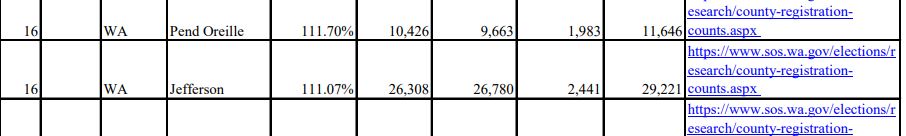 Yet Another Update: I stumbled on the Washington data in the table accompanying the Judicial Watch press release. It was not near the alphabetical end of their table, but in the middle. They grouped states by two categories and I initially missed that. Their data is taken from the Secretary of State’s website which apparently differs greatly with what the Jefferson County Auditor is reporting. The Washington Secretary of State, according to Judicial Watch, shows a total voter registration figure of 29,221 (the last figure to the right). That is the sum of active and inactive registrations from the immediately two proceeding columns. The eligible voter population they are reporting is 26,780, based on the Census Bureau’s most recent five-year estimate, which comes from data collected the monthly American Community Surveys. We still have a lot of unanswered questions. Auditor Carroll has promised an explanation to the Chair of the Jefferson County GOP by week’s end. By then I may have more information from Judicial Watch, as well.