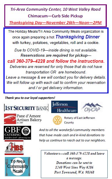 Sponsors of this year’s Thanksgiving meal include First Security Bank, Jefferson Healthcare, OlyCap, GBF (“God Bless Food”) Catering, Hadlock Building Supply, and the East Jefferson Rotary Club.