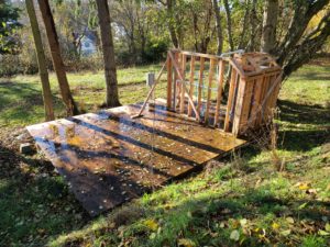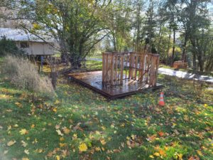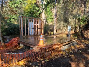 Fort Worden’s $2 million glamping project is a soggy mess. I walked the hillside where the glamping project was supposed to have 19 luxury tents completed by June. The clouds were spitting rain and the wind cut like a knife. I counted only 16 sites under construction. Only one luxo-tent is completed. That is the model home for the development, so to speak. The rest are in various states of being somewhat done to just started.