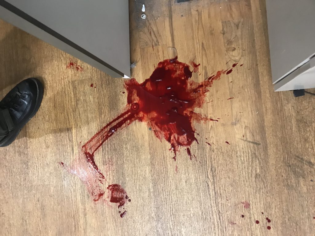 Beal grabbed a male nurse and swung to strike a blow, but thankfully did not connect as DuMond grabbed him. The next punch was for DuMond and it landed solidly on his face, snapping his head and upper body back violently. DuMond crumpled to his knees and may have lost consciousness (he had to watch video later to remember what happened after the blow to his head). Even then he held onto Beal as other officers brought Beal to the floor. Beal landed hard and the back of his head was cut. But nothing seemed to dampen his fury. Beal tried to break DuMond’s fingers then grabbed his face with his huge hand, while struggling to gouge out DuMond’s eyes. DuMond’s eyeglasses were broken but saved his eyes. Blood poured from his nose, mouth and open wounds all over his face. He wiped his blood on Sgt. Stevenson’s uniform so he could see as officers wrestled with Beal. Beal got his thumb and fingers inside DuMond’s mouth and was pulling at his cheek. DuMond’s blood must have been running down Beal’s arm.