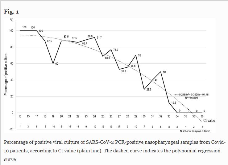 Yet another reputable study, by La Scola, et. al, published in the European Journal of Clinical Microbiology and Infectious Diseases, similarly found that the reliability of these tests drops significantly at 24-25 cycles, and, like the Mina graph, flat-lines at 34 cycles. “[P]atients,” according to the study, “with Ct values above 34 do not excrete infectious viral particles.”