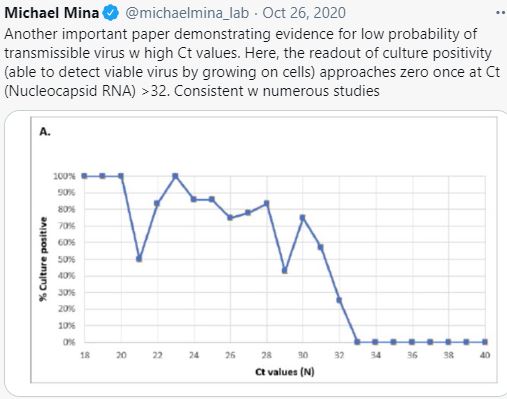 Dr. Mina posted this chart on October 26, 2020, demonstrating evidence for low probability of transmissible virus with high Ct values, in other words, how running more than 32 cycles can produce a practically meaningless positive test result. He wrote, “The readout of future positivity (able to detect viable virus by growing on cells) approaches zero once at Ct (nucleocapsid RNA) >32. Consistent with numerous studies.”