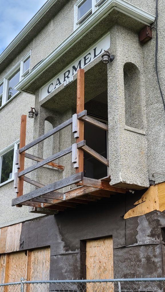 But almost four years earlier to the day, on May 10, 2017, city councilors and other local leaders gathered in the beer garden of the Pourhouse to watch the old Carmel House roll off its barge and begin its journey to its resting place on wooden blocks on a hillside overlooking the golf course. There it became “The Cherry Street Project.” There it sat for over two years on those wooden blocks. There it sits still, worse for wear as it falls apart, bit by bit.