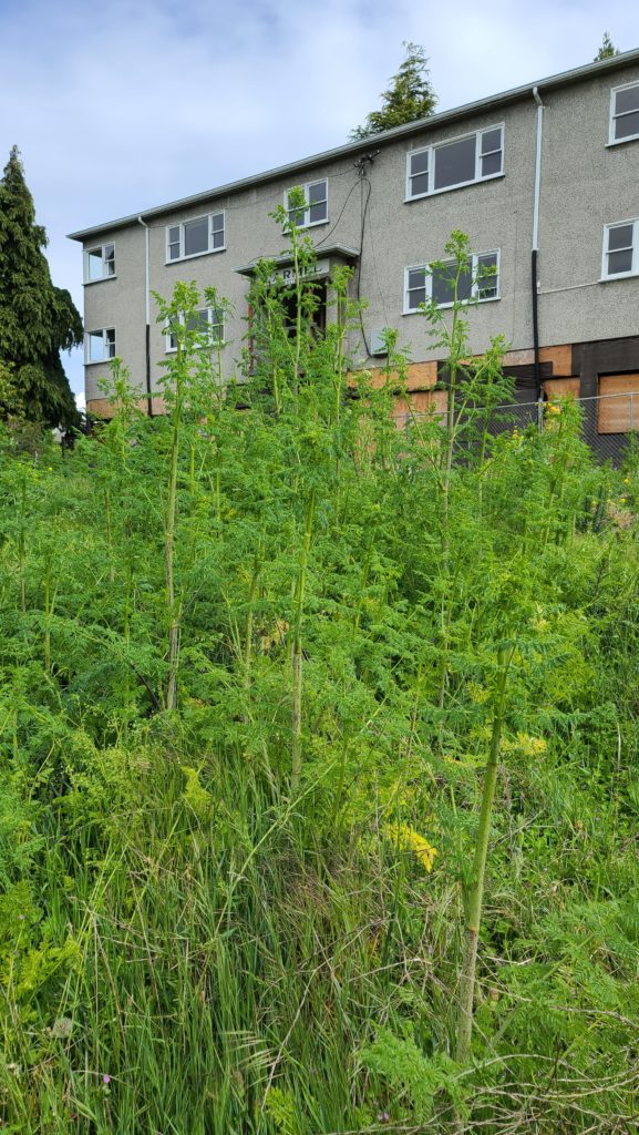 The homeless camp in the trees appears to have been abandoned. But a forest of poison hemlock has moved in. Stalks well over six feet tall cover about a quarter acre of land. On any other Port Townsend property, such a prolific display of uncontrolled noxious weeds would draw an army of inspectors, unpleasant, threatening letters and a bombardment of citations.