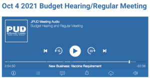 Click above for archived recording of October 4, 2021 PUD meeting. Agenda item Vaccine Requirement takes place from