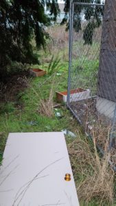 “Mom! They’re throwing a refrigerator out a window!” Teenagers easily gained entrance to the derelict Carmel House and trashed it. Almost every window has been broken. Furniture, light fixtures, random kitchen utensils, a door and, yes, a refrigerator were hurled through glass. I found shards of glass twenty yards from the building. There is broken glass everywhere. Rainspouts were ripped off and thrown over the fence. Drawers launched through the windows have been claimed by a cat as litter boxes.