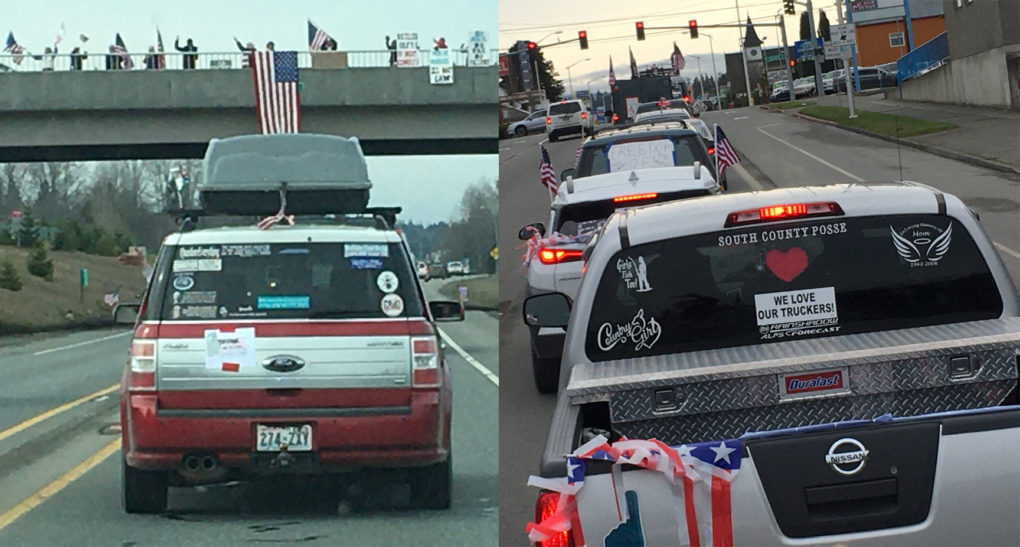 The Feb. 5th anti-mandate Port-to-Port Freedom Convoy drove between Port Angeles and Port Townsend, with supporters at overpasses along the way. Photos: Sue Coffman