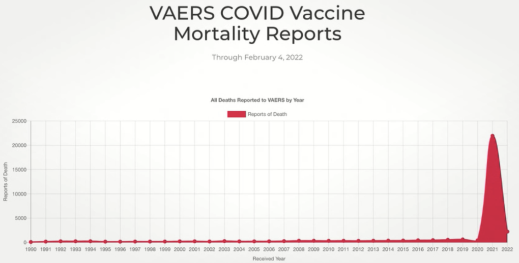 “Here in the US, insurance companies have released actuarial reports showing a massive, unexplained increase in mortality over the past year never before seen outside of wartime for Americans between the ages of 18 and 49. The cause? As yet unknown, but they all agree that it is not the Wuhan virus. This shocking discovery comes on the heels of the CDC having been caught hiding large swaths of critical information and data related to the mRNA injections, in particular the boosters, that prove the experimental drugs are largely or entirely ineffective in reducing hospitalizations, much less in saving lives, in precisely the same age range (18-49) that we now know have been dying in record numbers since the drugs came to market. More Americans are now putting two and two together and coming up with “no more.” Dr. Mark McDonald, 2/24/22