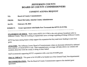 “The Jefferson County Board of County Commissioners values an electorate informed by unbiased news sources, of which KPTZ is one. Their expanded news coverage will help inform our citizens and residents about the work the county is doing on their behalf.”