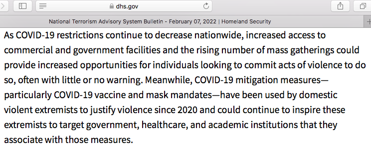 The authoritarian risks from this hate campaign are not just academic… an unhinged Department of Homeland Security has now issued a crazy dangerous bulletin targeting those spreading “misleading narratives” or factual “malinformation” including about “vaccine and mask mandates” as “domestic terrorists”!