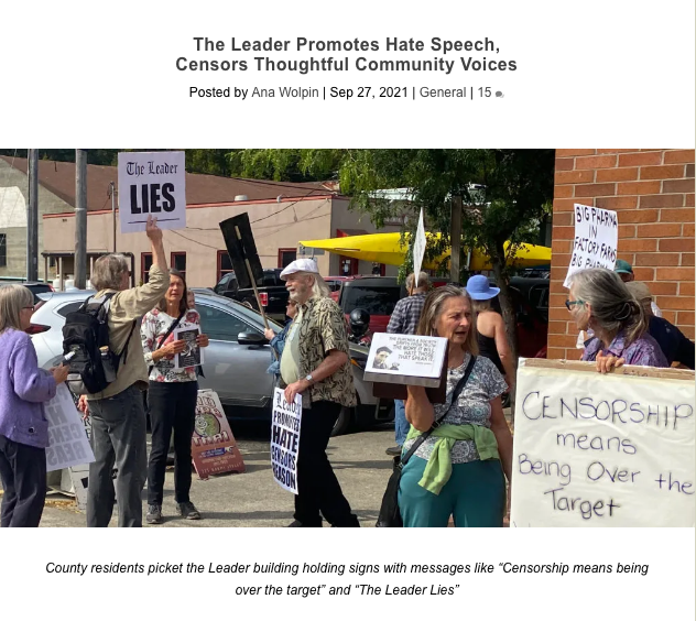 The Leader‘s blithe promotion of Mann’s provocative hate speech, coupled with their continued censorship of contrarian voices, unleased a flood of letters to the editor and critical responses online. When none of this criticism was allowed to see print in their Opinion Forum, protests outside the Leader offices followed.