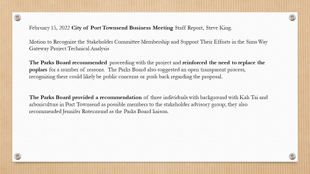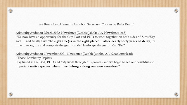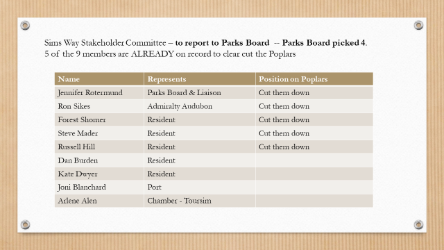 The Parks Board was able to choose 4 of the 9 members, and the City indicated from the outset that the Admiralty Audubon would be invited. The Port was guaranteed a spot as well. The general public was not allowed to serve on this hand-picked committee, which has been stacked with anti-poplar votes.