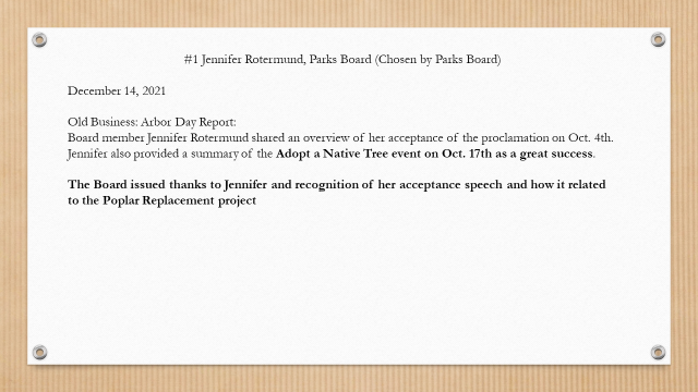 Andrea Hegland said, “Each Adopter can choose which poplar they want to adopt, along with a female Italian name painted on a name tag that will be affixed to their Adopted tree. Why Italian female names? Evidently some City decision makers believe these poplars represent white male European colonization. The thinking goes that cutting them down is part of the broader decolonization movement, and replanting with native trees would be more feminine.” Hegland added, “This seems to be a high-jacking of legitimate movements, such as decolonization and feminism, to justify the destruction of the poplars.”