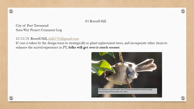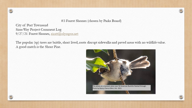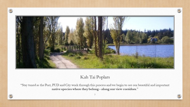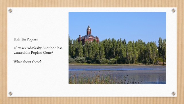 In the 2022 report, again with a narrow focus on just the trees on the south side, and not a comprehensive contextual analysis considering the long history of these trees in this community, or the fact that cutting the poplars on the north side does not remove the poplars within Kah Tai, which is a stated objective the Admiralty Audubon— and the fact that this is a busy highway with over 10,000 average vehicle trips per day and not suitable for attracting wildlife. She seems a bit…confused…excerpts from her 2022 report: