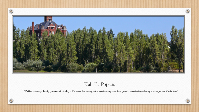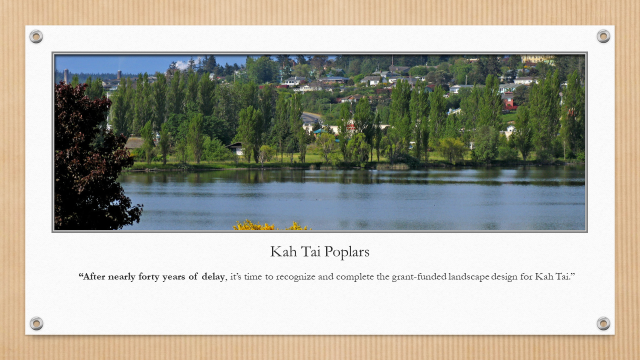 I also read the Kah Tai ’86 Landscape Plan where it is recommended to selectively thin the Poplars to keep an open view into the Park, and to do pruning and sucker mowing to keep the Poplars healthy and contained. This recommendation is keeping with the following Gateway Plan approved after in 1993 that the Kah Tai group were a part of creating. The Plan that Page 18 of 20 recommended replanting any aging or compromising Poplars with the younger ones that were purposely planted.