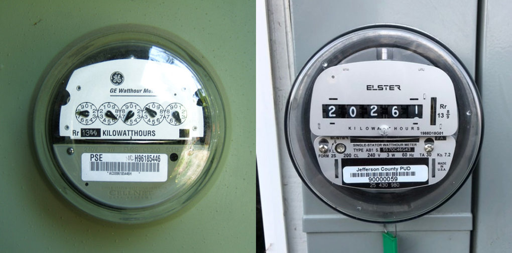 Two styles of analog meters our PUD is using for opt-outs — the original “clock face” style that records usage on small dials and a later style with a numerical display.