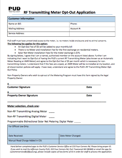 This RF Transmitting Meter Opt-Out Application is on the last page of the PUD packet here. For more information on the Smart meter rollout in progress in Jefferson County and for additional details on our PUD’s Opt-Out Program, see Smart Meters Coming to a Neighborhood Near You!