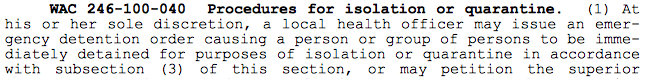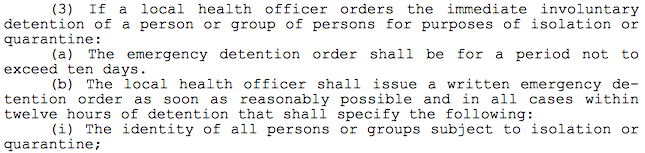 This quarantine law provides narrow emergency detention powers to health officers for up to 10 days over infected persons posing serious and imminent risk, but only after a long series of provisions and recourses have been exhausted — none of which in any way applied to or authorized Health Officer Berry’s open-ended discriminatory regulation over restaurant/bar business practices, requiring them to demand HIPAA-protected private health information from their patrons.