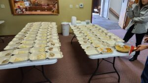 For each outing, the teams prepared food for forty people, the approximate population in the woods around the large grassy field to the east of the roundabout at the city’s entrance. This day’s meal was enchilada casserole. The week before it had been pastrami, ham and roast beef sandwiches. There’s always a side dish or salad, and always homemade cookies. The teams also distribute gallon jugs of water. McCutcheon started doing that after encountering a woman trying to wash her face with alcohol wipes.