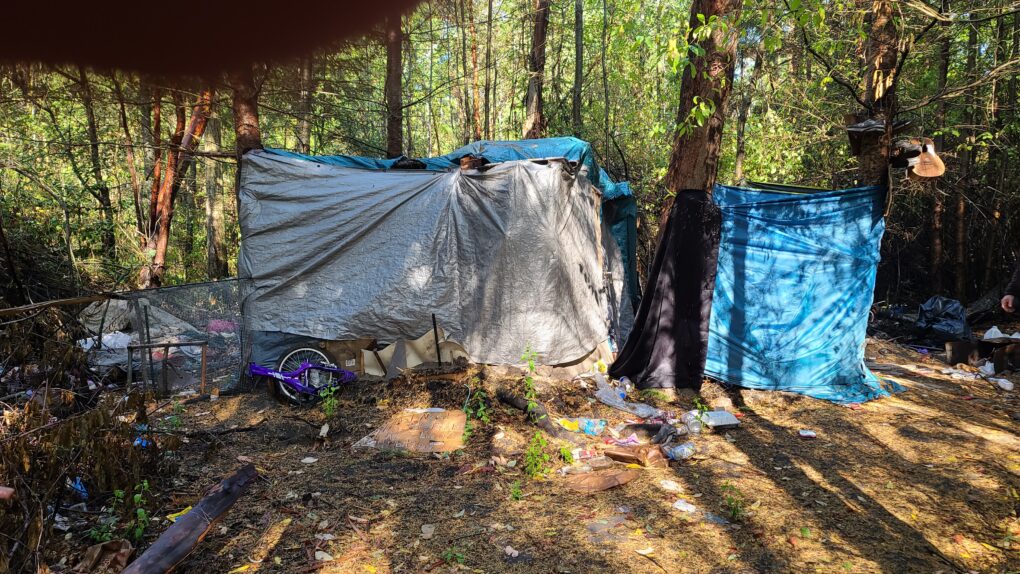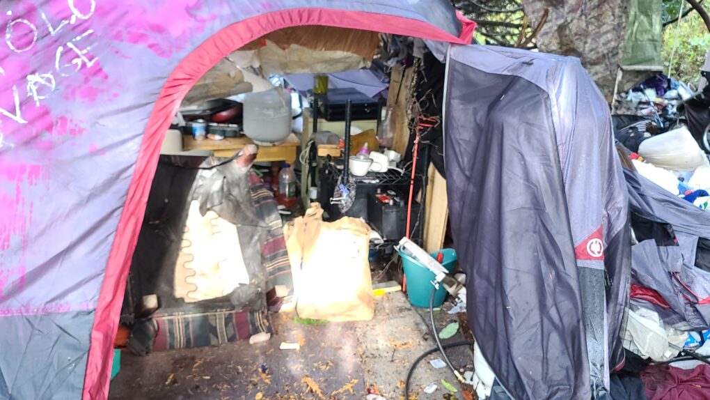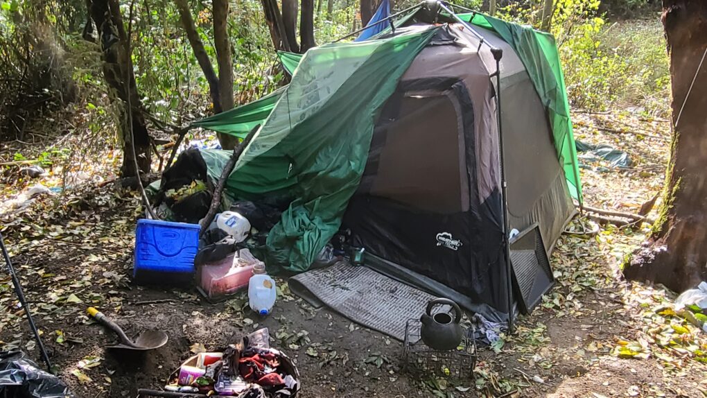 The following photos are but a small sampling of what’s under those trees. The featured photo (at the top of this article) shows a sprawling tent complex on city property. It is far too large to capture in one shot. The photo was taken in the approximate center of the complex, with debris and trash in every direction.