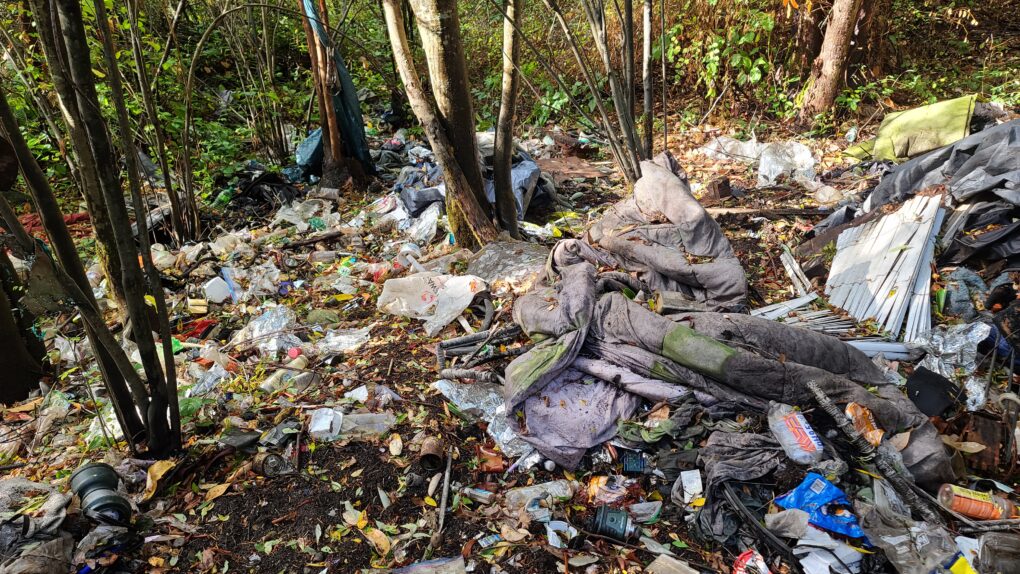 Well established campsite, surrounded by debris. Several people live here.