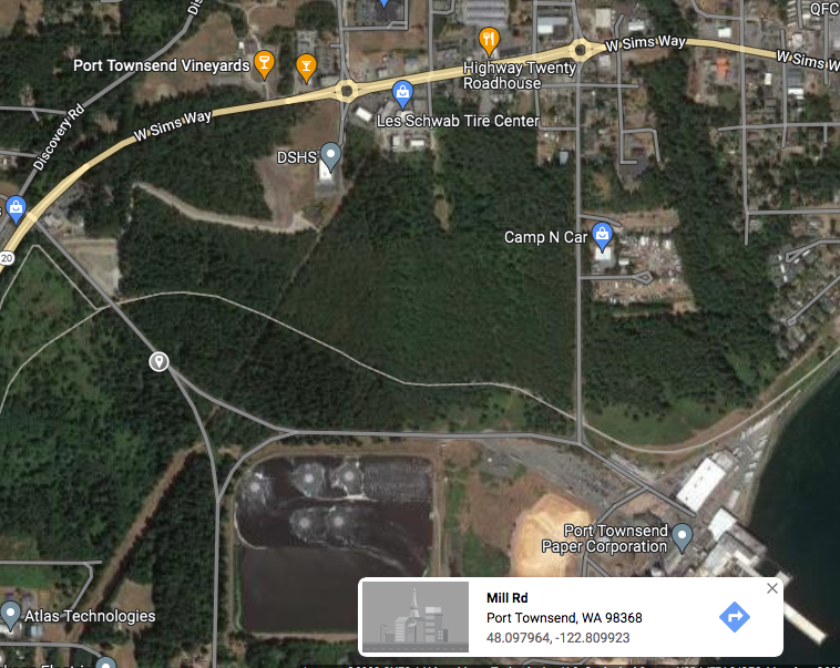 It encompasses the city’s newly acquired Evans Vista parcel and land belonging to the Port Townsend Paper Company (“the mill”), claims the trees around the field with the state Department of Social and Health Services building (DSHS), and ends behind Les Schwab and the other businesses on that side of Sims Way at the first roundabout.