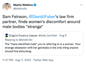 Though Sam Feinson isn’t known for social media posts about having sex with chickens and dogs, like his partner David Faber, he did get some attention for this tweet to women’s rights activist, Mattie Watkins, insisting that the biological male Julie Jaman encountered in the locker room on July 26th was really a woman, because — he said so: