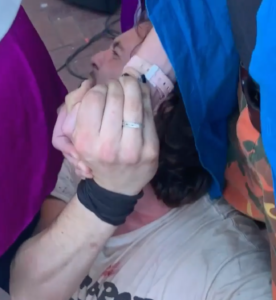 “My assailant was lying on the ground very close to the PA, attempting to disable it. At that moment he kicked me very hard in the genitals. In great pain, I doubled over for a moment and then I stood up straight and looked down at him. He looked back at me and said, “Yeah! You want some more?!”
