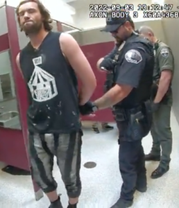 On the lookout, PTPD Officer Chase Stanton spotted him entering the public restroom in the Cotton Building. According to his Supplemental Report filed on Sept. 4th, he contacted his team, and entered the bathroom with two JCSO deputies. The arrest was filmed by law enforcement body cams, the footage of which was acquired through public records requests by Crystal Cox, one of the many women who were assaulted on August 15th.