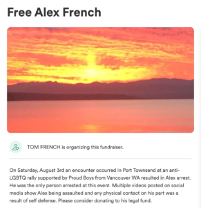 On September 3rd, a rally organized by members of Washington Three Percenters and the Proud Boys, ostensibly in support of the women and men who were verbally and physically attacked there by the hateful mob a couple of weeks earlier, drew a large crowd of pro-trans opponents as well as roughly 50 law enforcement officers from the city, county and state. As fate would have it, Alexander French could not resist the call of the wild, his chance to be “victimized” once again.