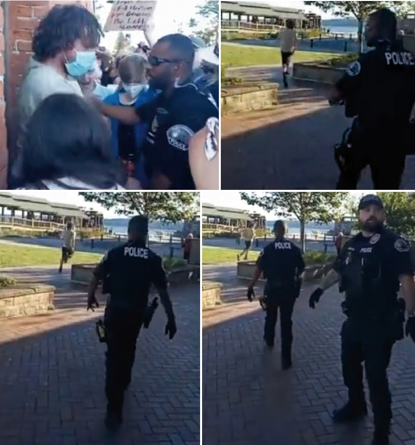 The men are then approached by three women and a man insisting that they come over to aid and prevent harm coming to the speakers. They’re told that it is not the role of the police to prevent harm, only to respond if it occurs.
