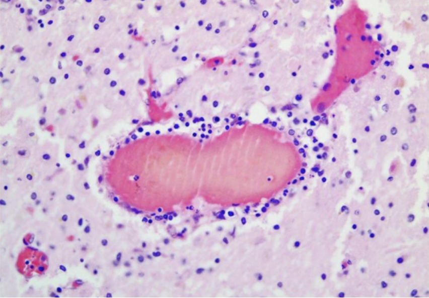 The above image (also from the Mörz article) is a cross section through a capillary in the brain. It shows prominent signs of vasculitis (inflammation of the blood vessel wall). The vessel is filled with hemolyzed blood, which is normal in autopsied cases. The many tiny blue cells that are present in the walls of the vessel (immediately surrounding the hemolyzed blood) include many lymphocytes (inflammatory cells). The presence of numerous lymphocytes in the wall of this vessel means that the vessel wall is inflamed—-i.e., the vessel is experiencing vasculitis.