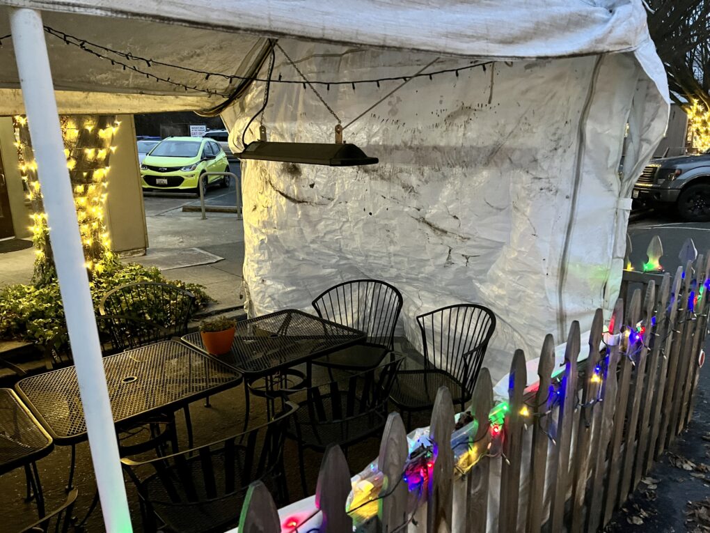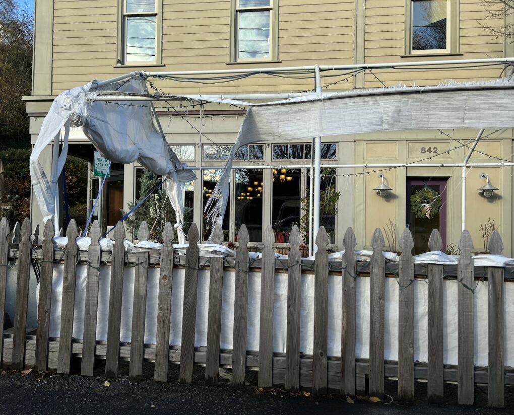 As year-end approaches for the expiration of the streatery temporary use permits — which despite public outcry, the City Council extended yet again last May — five rarely-used eyesores remain. Our last article focused on Alchemy’s ripped, moldy and potentially hazardous gutter tent next to Haller Fountain. This roundup will provide an update on that situation and take a look at the four other streateries which have continued to eliminate precious downtown parking during the peak holiday shopping season despite disuse and disgruntled neighbors.