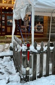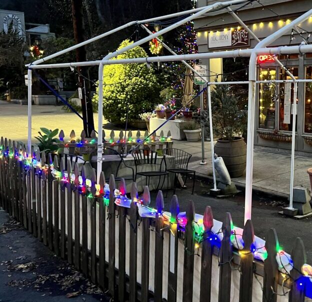 Our November 30 article focused on the ugly mess in front of Alchemy just days before Main Street’s annual Christmas tree lighting at Haller Fountain. It described the upset among neighboring businesses and wondered why the City was allowing it to remain. The tent was not removed before the event, continued to deteriorate (shown below on Dec. 3), and is still in place.
