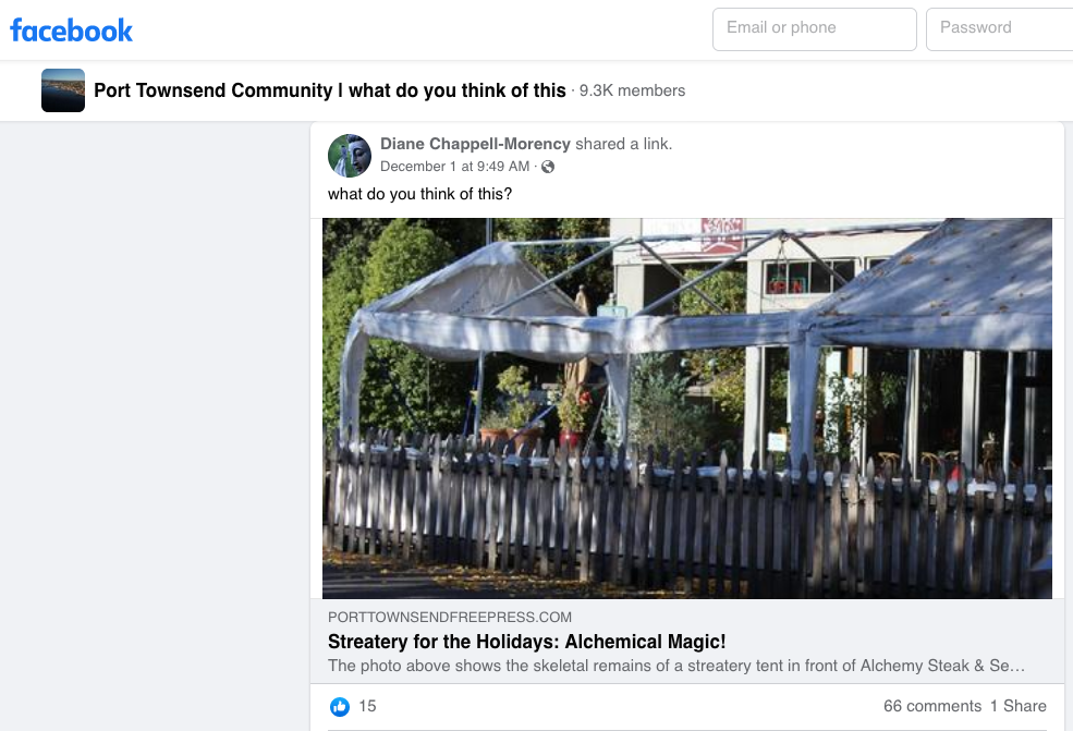 Following the publication of our November 30 article, a Free Press reader alerted us to a question posed to a large local Facebook group called Port Townsend Community. A member of the group asked “What do you think of this?” and gave a link to our article about the Alchemy tent.